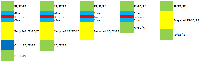 加工原料:PP, PE, PS及特殊的用于共擠結構EVOH和EVA等